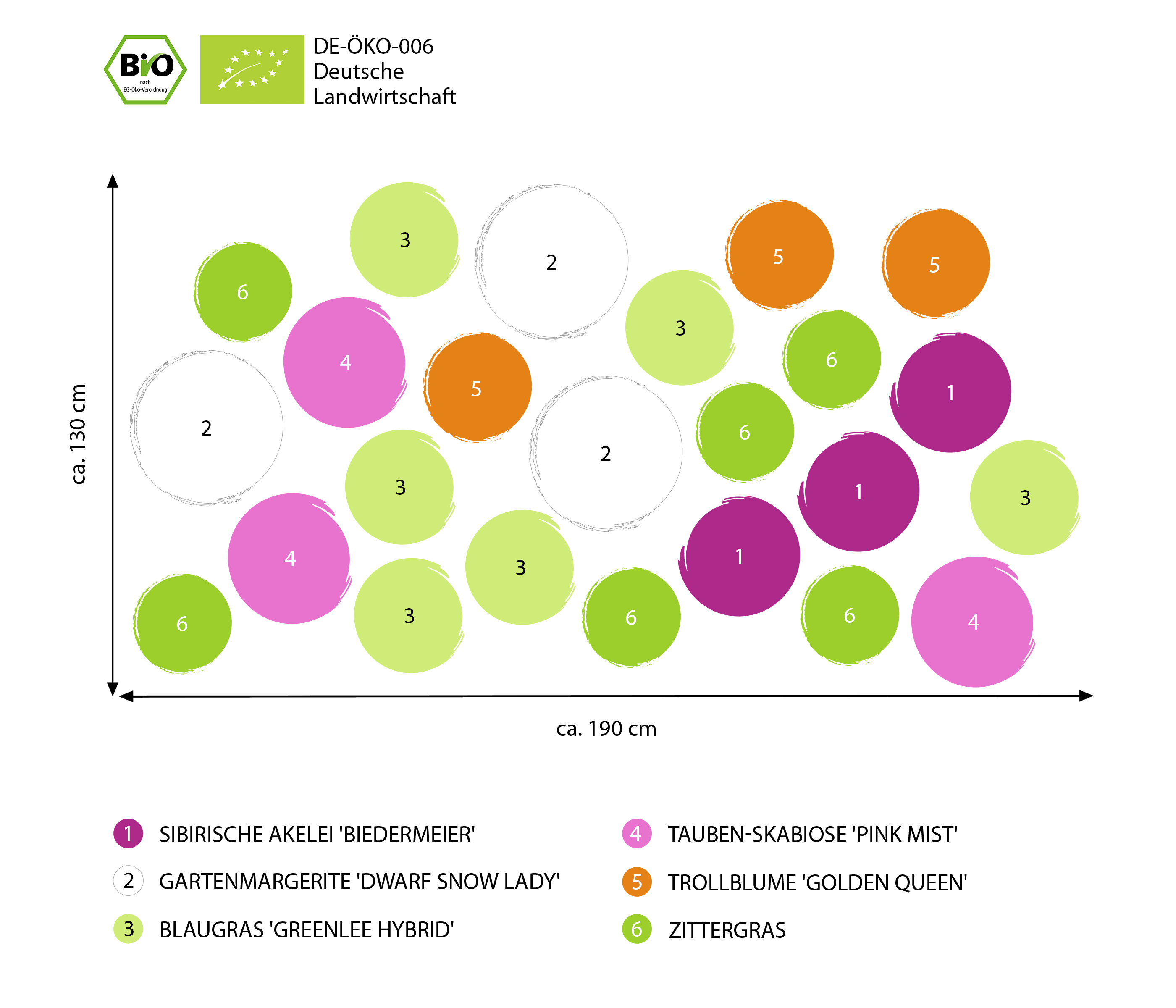 Set aus 24 Bio Pflanzen: 3x Sibirische Akelei 'Biedermeier', 3x Gartenmargerite 'Dwarf Snow Lady', 6x Blaugras 'Greenlee Hybrid', 3x Tauben-Skabiose 'Pink Mist', 3x Trollblume 'Golden Queen', 6x Zittergras