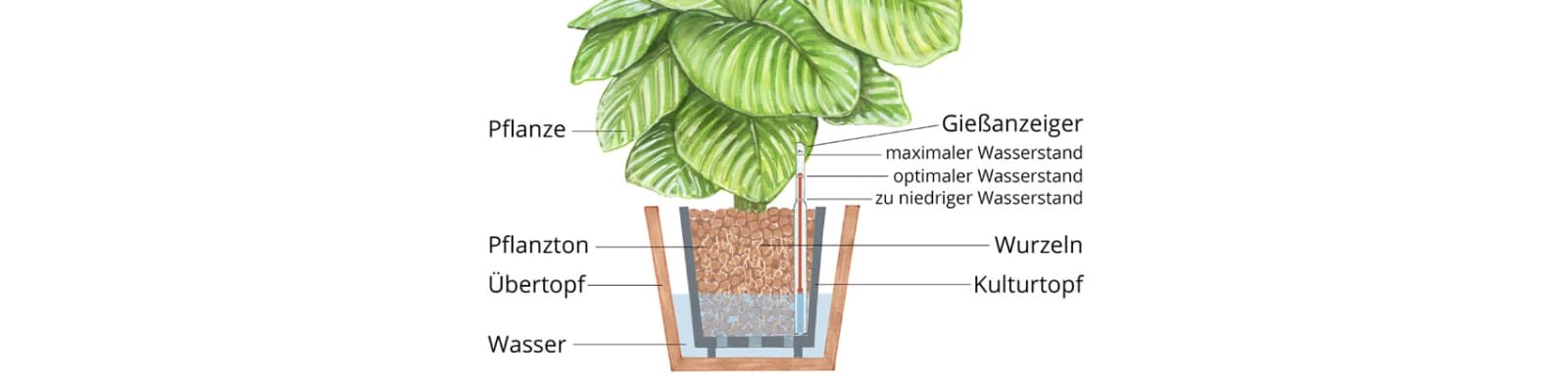 Wie der Name verrät, basiert die Hydrokultur auf Wasser (hydro = Wasser). Pflanzen entwickeln dabei im Laufe der Zeit Wasserwurzeln statt Erdwurzeln und können so in speziellen Töpfen optimal platziert werden. Wichtig sind neben den passenden Töpfen ein geeignetes Substrat wie Blähton oder Pflanzton sowie ein Wasserstandsanzeiger, der die Pflege erleichtert.